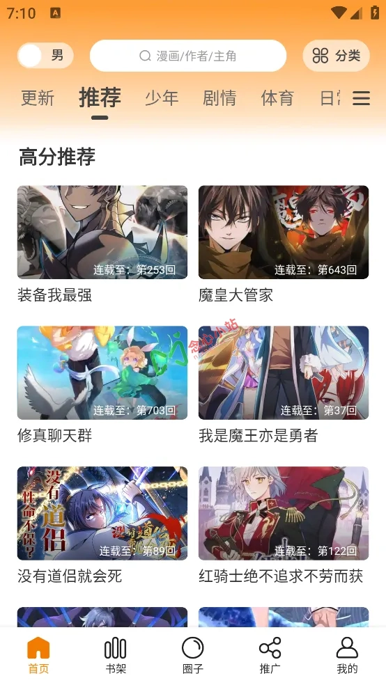 在首页显示的推荐页面,有高分推荐、热门推荐猜你喜欢,顶部可以切换分类,左上角可以切换男频和女频。
